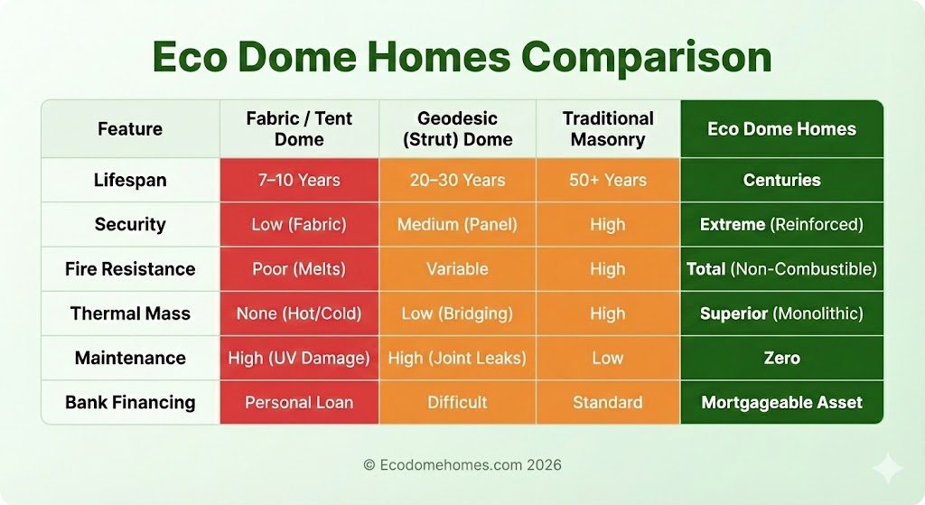 Fabric domes are excellent for a festival, but they are a liability for an investment portfolio. They are temporary structures that offer zero protection against the elements or intruders.