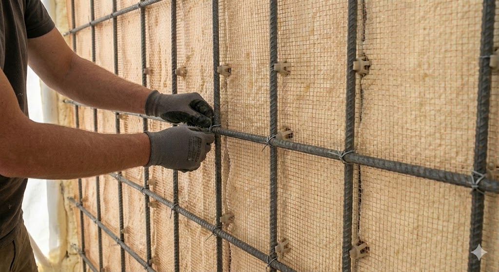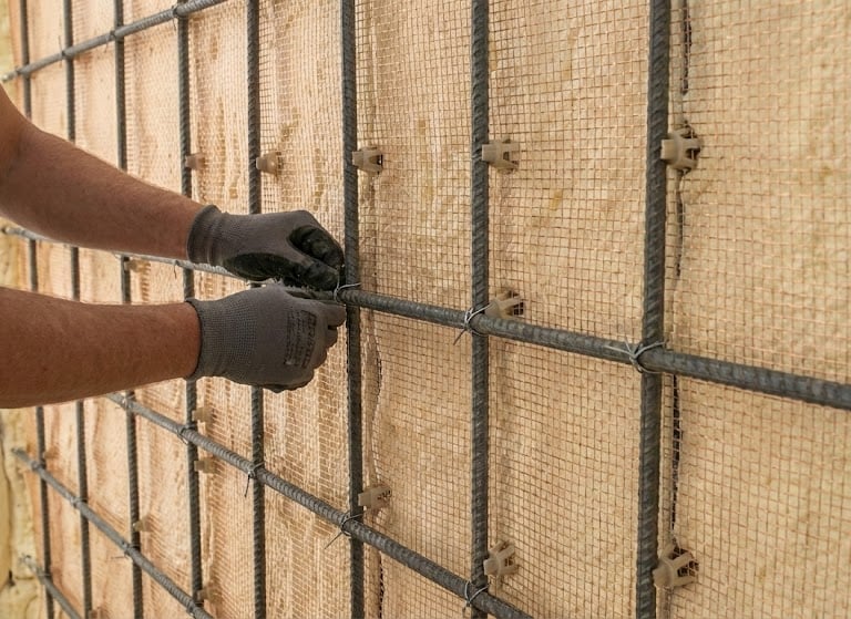 We do not use steel rebar, which rusts and causes "concrete cancer." We use Basalt Rebar—reinforcement made from volcanic rock.