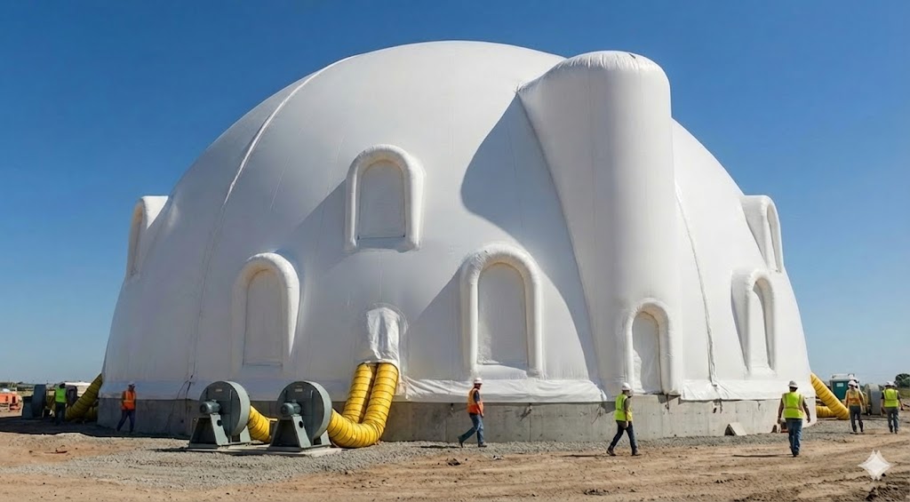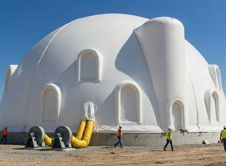 The Process: A custom-engineered, high-pressure membrane is inflated on-site. It acts as a "balloon formwork," creating the perfect geometric shape of your home using nothing but air pressure.