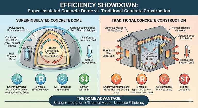 The "Thermal Battery" Effect: By placing this continuous layer of closed-cell insulation on the outside of the concrete shell, the concrete is protected from external temperature swings. The concrete absorbs your interior heating or cooling, acting as a massive "thermal battery" that keeps the home perfectly temperate year-round with minimal HVAC usage.